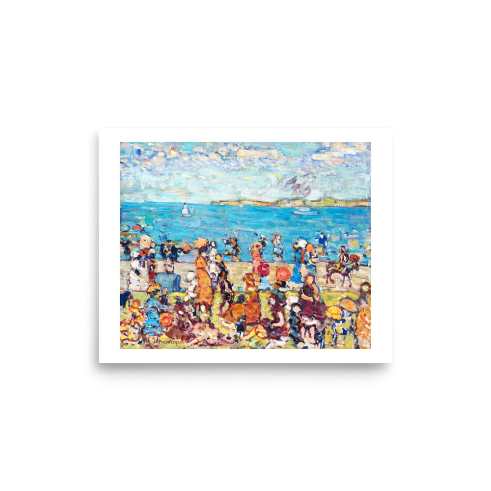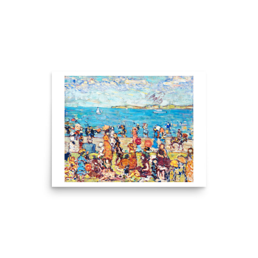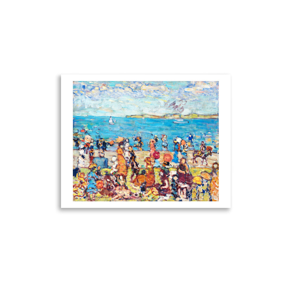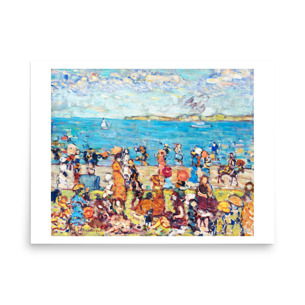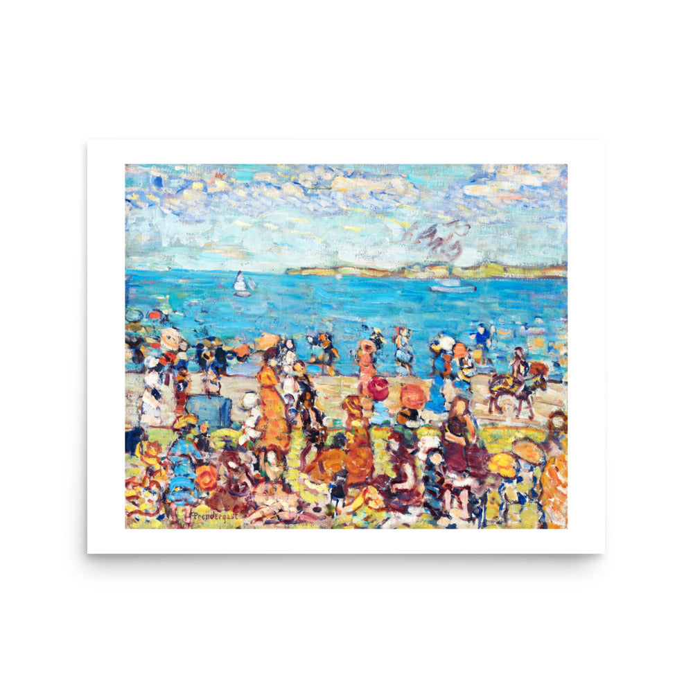 A mosaic of sunlit color and motion, Maurice Prendergast’s Beach Scene captures the vibrant rhythm of leisure by the sea. Figures gather in patterned dresses and broad hats, rendered in playful, fractured brushwork. The composition feels both spontaneous and stylized — a celebration of summertime, social ritual, and the beauty of fleeting moments.