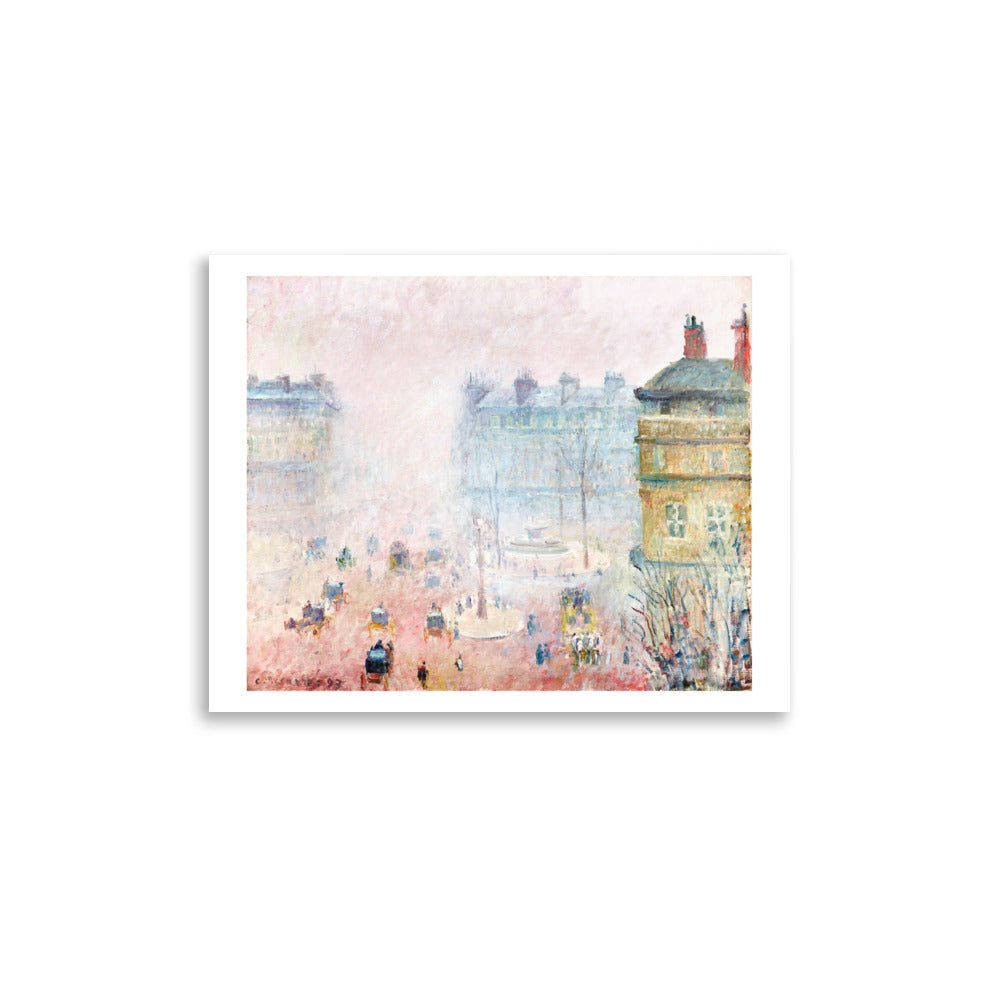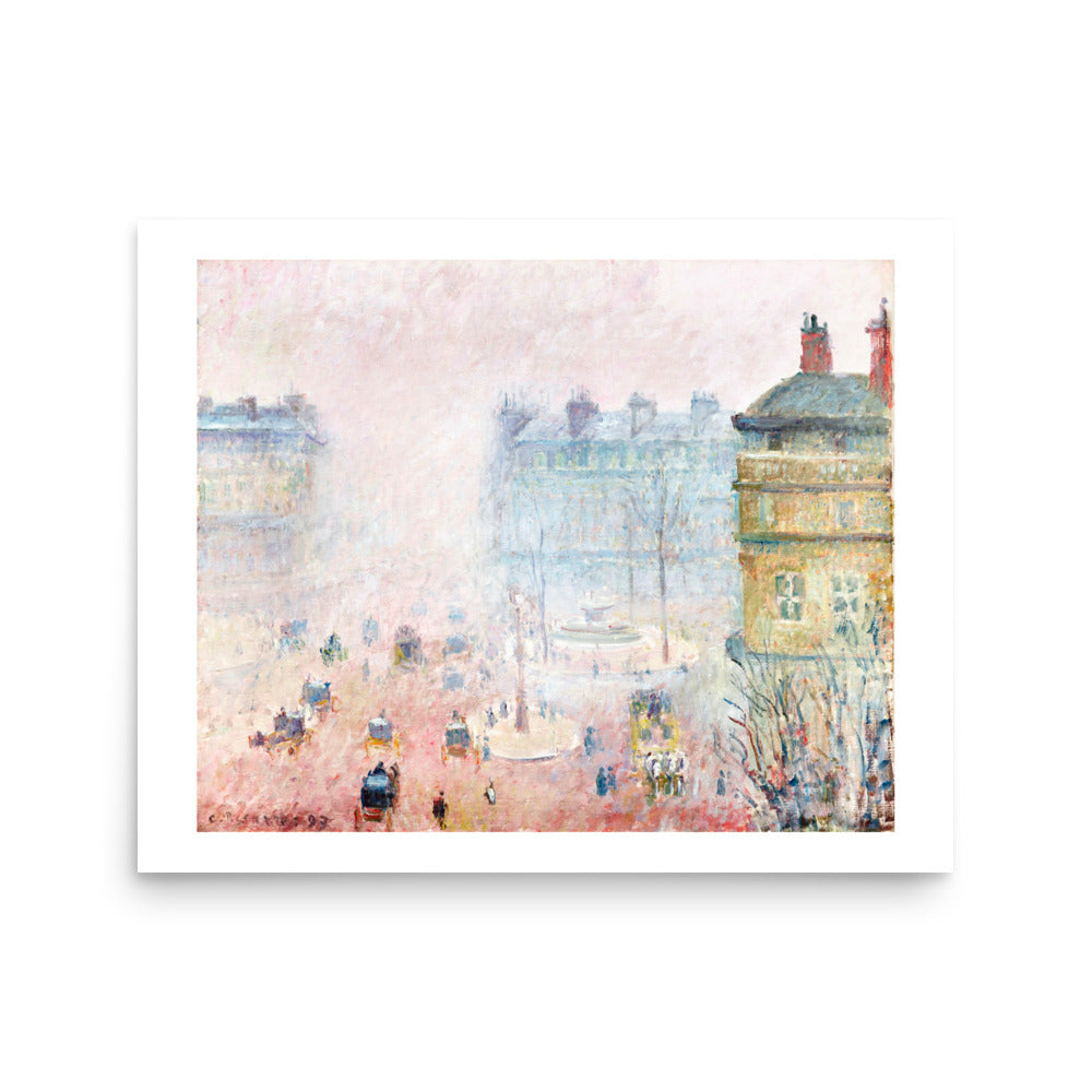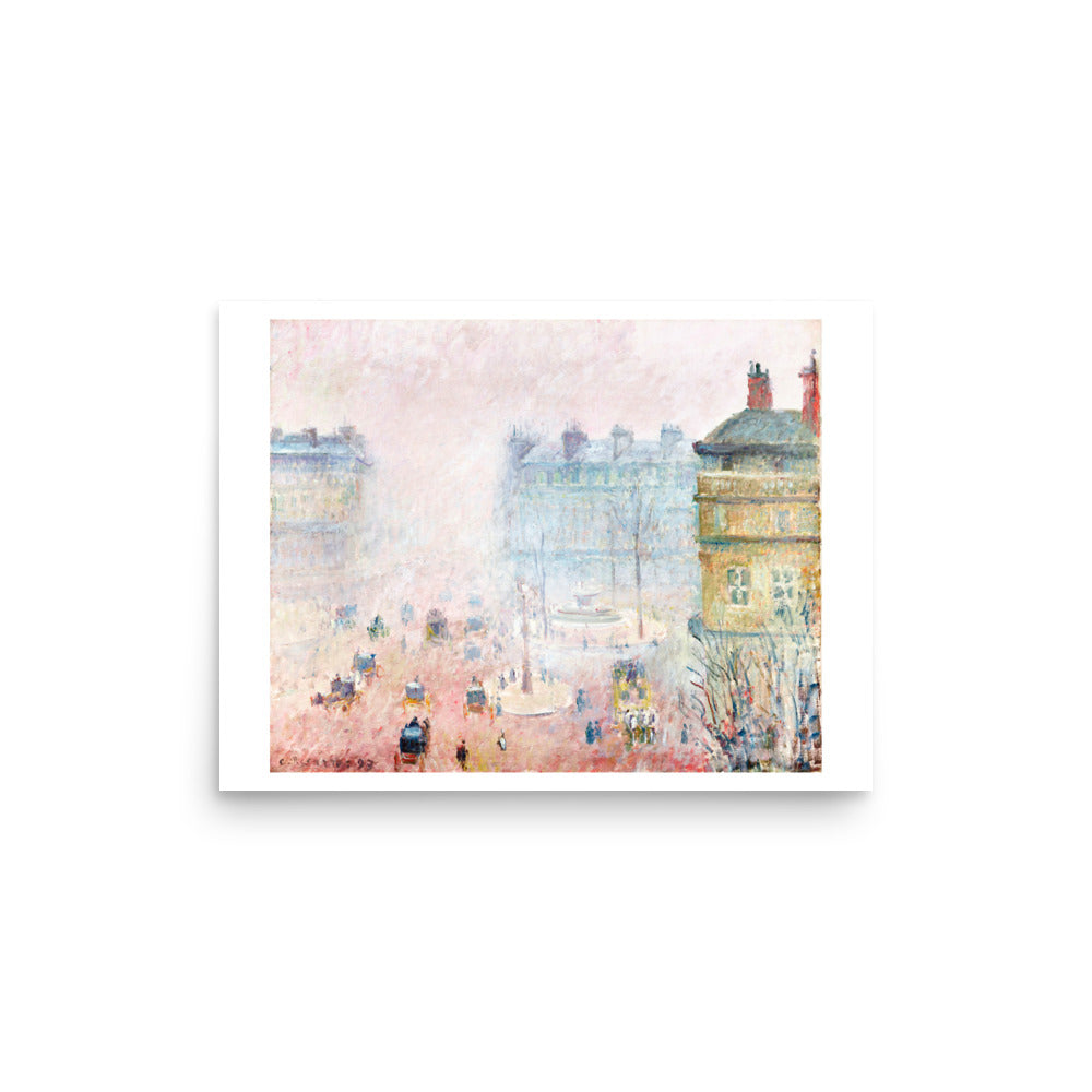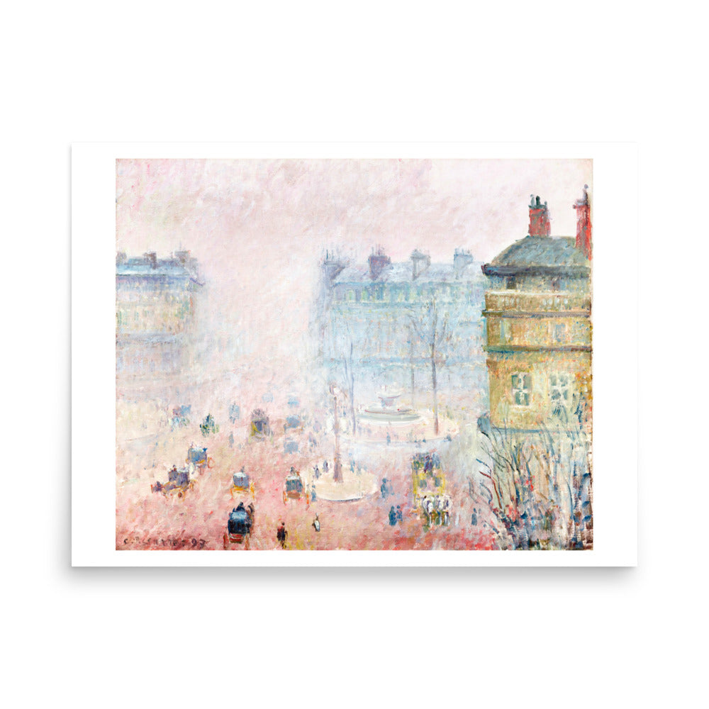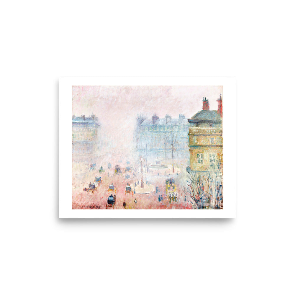 In this softly veiled cityscape, Camille Pissarro renders the bustle of Paris through a haze of diffused light and motion. Figures and carriages emerge from the fog in delicate rhythms, while the street glows with Impressionist subtlety. It’s a portrait of modern life — not defined by detail, but by atmosphere, memory, and mood.