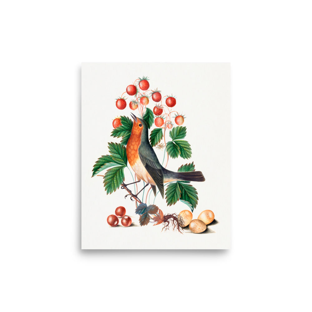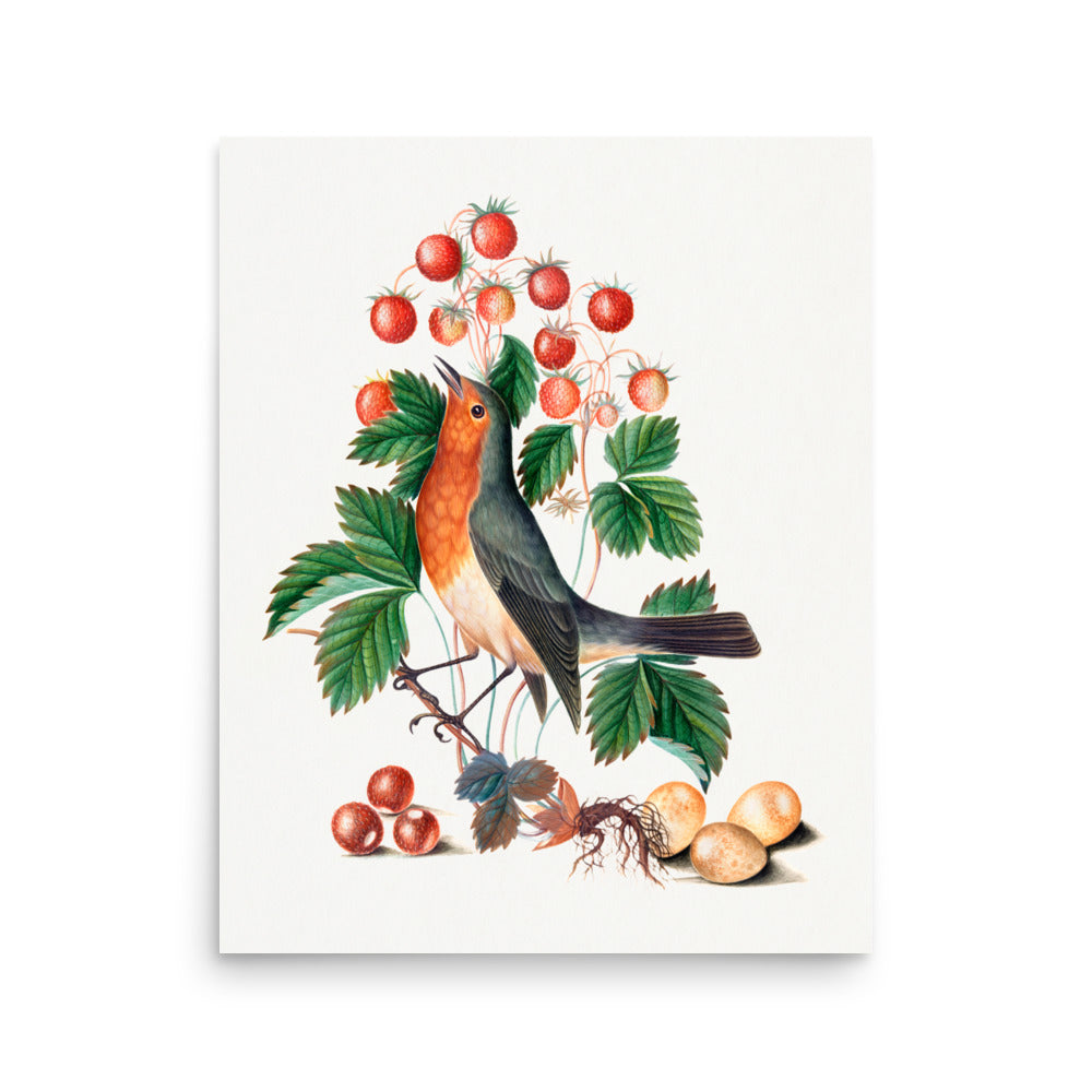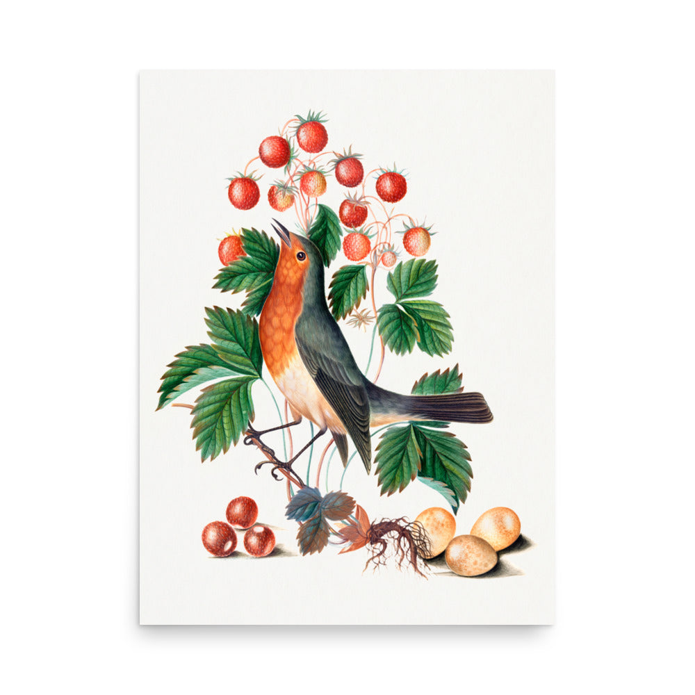 A tender encounter between flora and fauna, this 18th-century illustration by James Bolton pairs the delicate form of a European robin with the quiet charm of wild strawberries. With scientific precision and artistic sensitivity, the composition celebrates the gentle harmony of the natural world — detailed, balanced, and full of quiet life.